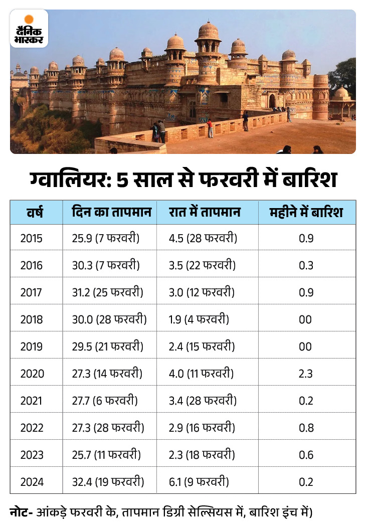 ग्वालियर में कड़ाके की ठंड ग्वालियर में तेज ठंड का ट्रेंड रहता है। इसकी वजह यहां सीधे उत्तरी हवाएं आना है। वर्ष 2018 में 1.9 डिग्री, 2019 में 2.4 डिग्री, 2022 में 2.9 डिग्री और 2023 में पारा 2.3 डिग्री तक पहुंच चुका है। 10 साल में एक बार भी पारा 7 डिग्री से ज्यादा नहीं रहा। दूसरी ओर, 7 फरवरी 1974 को रात में पारा 0.3 डिग्री रहा था, जो ओवरऑल रिकॉर्ड है। 27 फरवरी 2014 को दिन का तापमान रिकॉर्ड 37.2 डिग्री पहुंच चुका है। वहीं, वर्ष 1898 में इस महीने में करीब 4 इंच बारिश हुई थी।