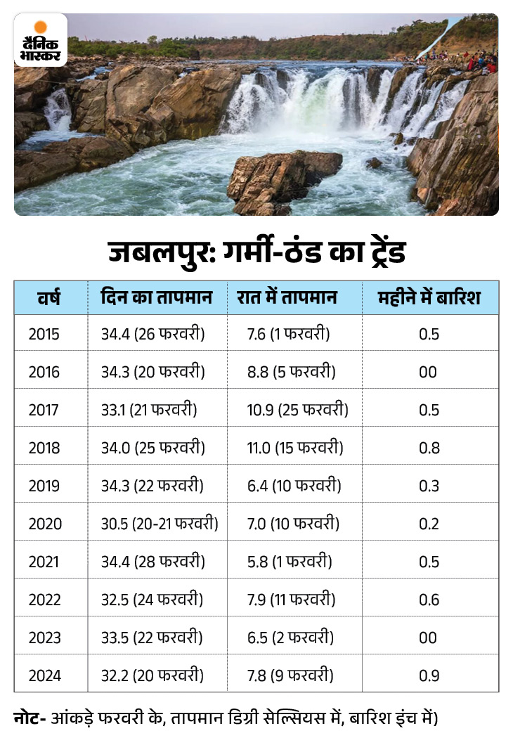 जबलपुर में भी बदला रहता है मौसम जबलपुर में भी मौसम बदला रहता है। फरवरी के दूसरे सप्ताह के बाद दिन का अधिकतम तापमान 30 डिग्री से अधिक रहता है, जबकि रात में तापमान न्यूनतम 11 डिग्री के आसपास रहता है। पिछले साल बारिश नहीं हुई थी, लेकिन इससे पहले फरवरी में बारिश होने का ट्रेंड रहा है। रिकॉर्ड की बात करें तो 2 फरवरी 1905 को न्यूनतम तापमान 0 डिग्री रहा था, जो ओवरऑल रिकॉर्ड है। वहीं, 27 फरवरी 1966 को दिन का तापमान 37.6 डिग्री रहा था। साल 1942 को पूरे महीने करीब 6 इंच बारिश हुई थी। 24 घंटे में सर्वाधिक बारिश होने का रिकॉर्ड 27 फरवरी 1987 को दर्ज हुआ था। इस दिन 131.7 मिमी यानी, 5 इंच से ज्यादा बारिश हो गई थी।