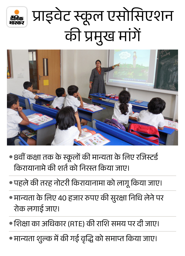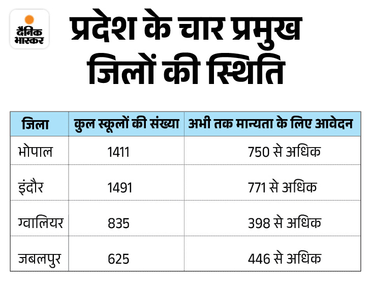 इधर, तारीख बढ़ाई, 7 फरवरी तक कर सकेंगे आवेदन प्राइवेट स्कूल एसोसिएशन ने मान्यता में नियमों के बदलाव को लेकर 30 जनवरी को हड़ताल की। 31 जनवरी मान्यता के लिए आवेदन करने की आखिरी डेट थी। इस दिन करीब 2.5 हजार स्कूलों ने मान्यता के लिए आवेदन किया। इस तरह से प्रदेश में कुल 10 हजार से अधिक स्कूल मान्यता के लिए आवेदन 31 जनवरी तक कर चुके हैं।