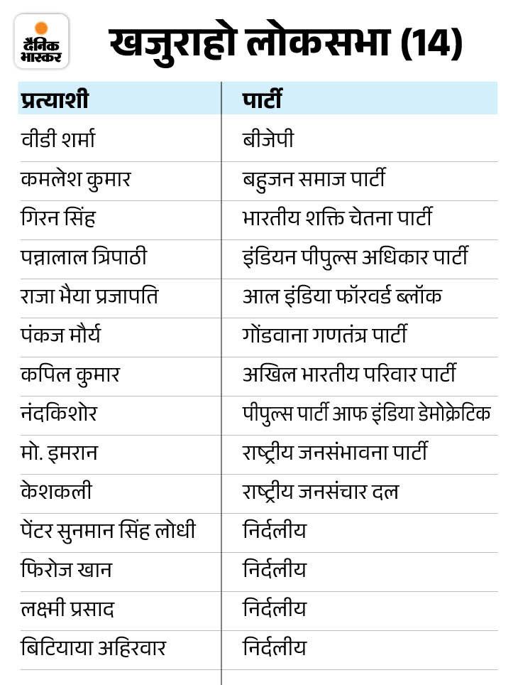 खजुराहो लोकसभा सीट पर बीजेपी प्रत्याशी और पार्टी के प्रदेश अध्यक्ष वीडी शर्मा के सामने 13 प्रत्याशी मैदान में हैं। नाम वापसी के बाद इस सीट पर वीडी समेत कुल 14 प्रत्याशी चुनाव लड़ रहे हैं।