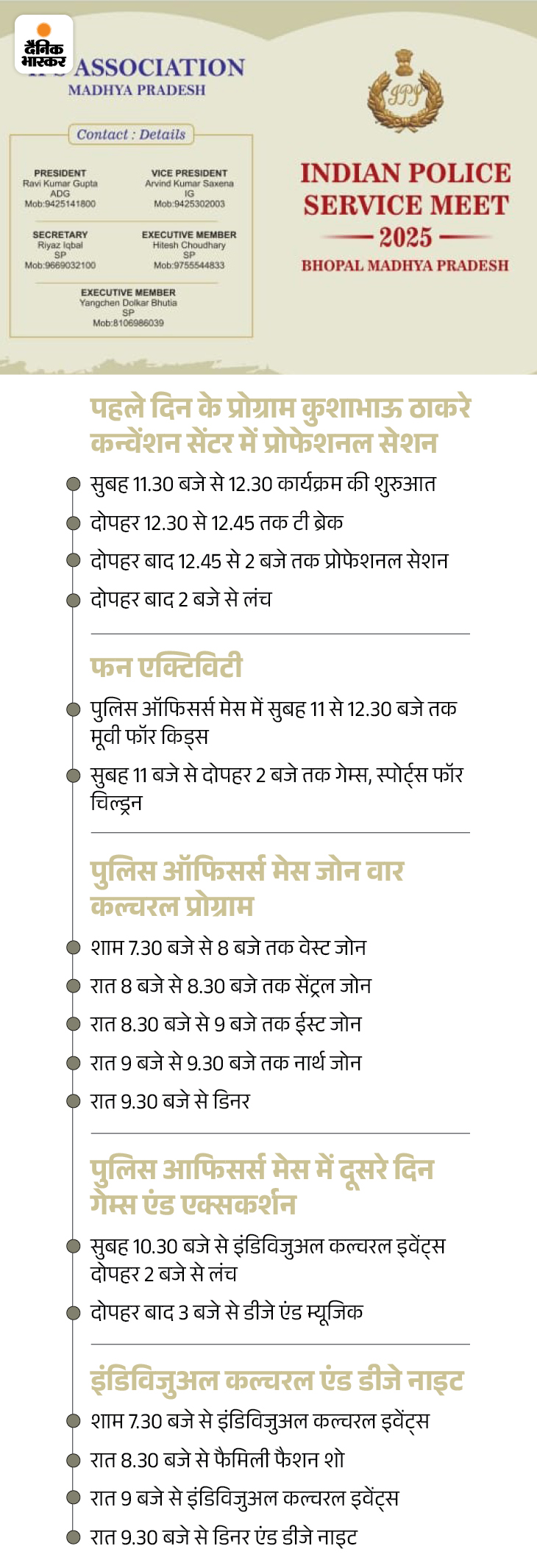 पहले दिन एमपी पुलिस के मॉडल इन्वेस्टिगेशन और मॉडल पुलिस वर्किंग का प्रजेंटेशन होगा। कुशाभाऊ ठाकरे कन्वेंशन सेंटर में रतलाम एसपी अमित कुमार और रेल एसपी राहुल लोढा प्रजेंटेशन देंगे। इसमें मॉडर्न टेक्नोलॉजी के जरिए क्राइम कंट्रोल कैसे किया जाए, इसको लेकर पुलिस अफसरों को ट्रेनिंग देने का प्रोग्राम है। इस सर्विस मीट में डीजीपी कैलाश मकवाना समेत सभी आईपीएस अफसर परिवार जनों के साथ शामिल होंगे। उद्घाटन सत्र कुशाभाऊ ठाकरे कन्वेंशन सेंटर में होगा जबकि बाकी कार्यक्रम पुलिस आफिसर्स मेस में किए जाएंगे। मीट में हिस्सा लेने के लिए प्रतिनियुक्ति पर पदस्थ अफसरों को भी बुलाया गया है।