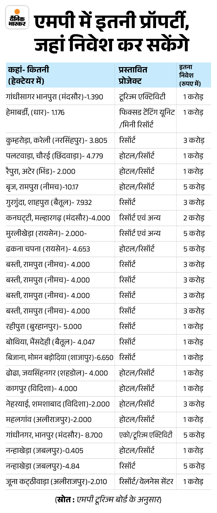 जंगल में प्रॉपर्टी, इसलिए टूरिज्म के लिए खास बोर्ड के अफसरों ने बताया, प्रॉपर्टी ऐसी जगह पर हैं, जहां टूरिज्म एक्टिविटी आसानी से हो सकती है। मंदसौर के गांधीसागर में तो हरियाली के बीचोबीच प्रॉपर्टी है। वहीं, धार के हेमाबर्डी में फिक्सड टेंटिंग यूनिट यानी, टेंट सिटी बनाई जा सकती है। अलीराजपुर के कट्ठीवाड़ा, बैतूल के भैंसदेही, मंदसौर के मल्हारगढ़, जबलपुर के नन्हाखेड़ा जैसी लोकेशन भी हैं।