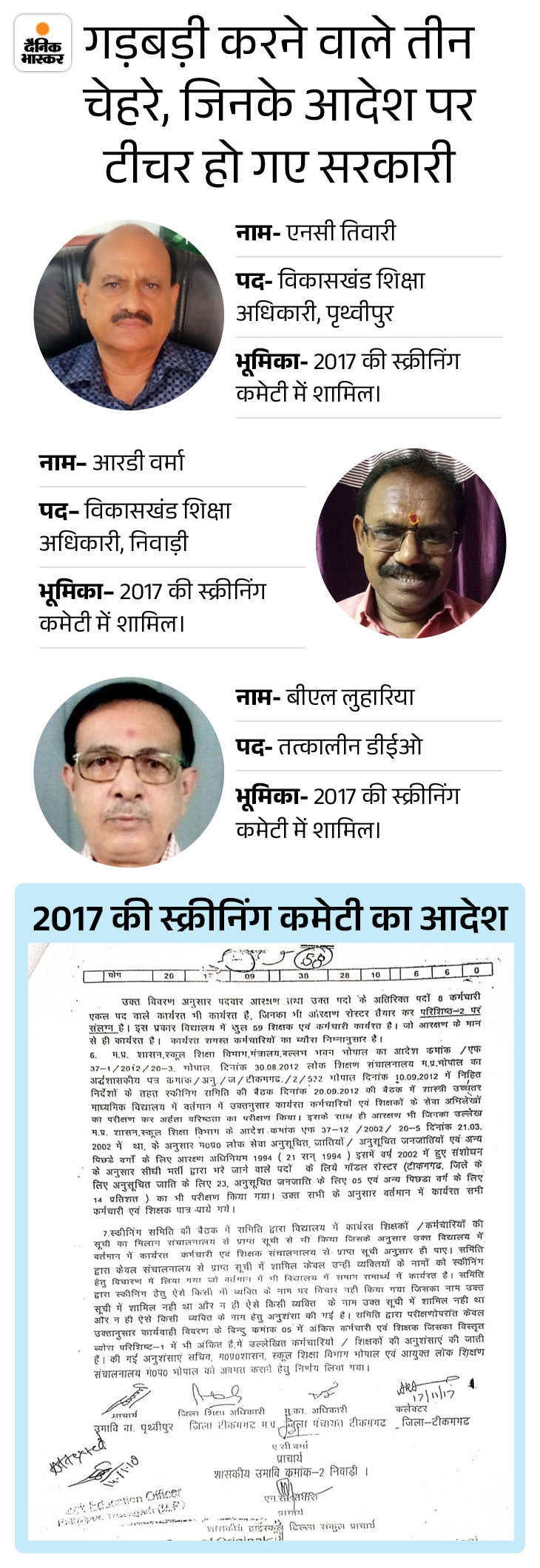 अब जानिए कैसे हुआ फर्जीवाड़े का खुलासा इसका खुलासा तब हुआ, जब नैगुवां के हायर सेकेंडरी स्कूल के प्रिंसिपल राजेंद्र पाठक को 31 मार्च 2023 को निवाड़ी जिले का डीईओ बनाने के आदेश जारी हुए। इस आदेश के बाद एक गोपनीय शिकायत हुई। जिसमें लिखा था कि पाठक तो जिला पंचायत के अधीन आने वाले स्कूल के प्रिसिंपल हैं। वे स्कूल शिक्षा विभाग के कर्मचारी भी नहीं हैं।