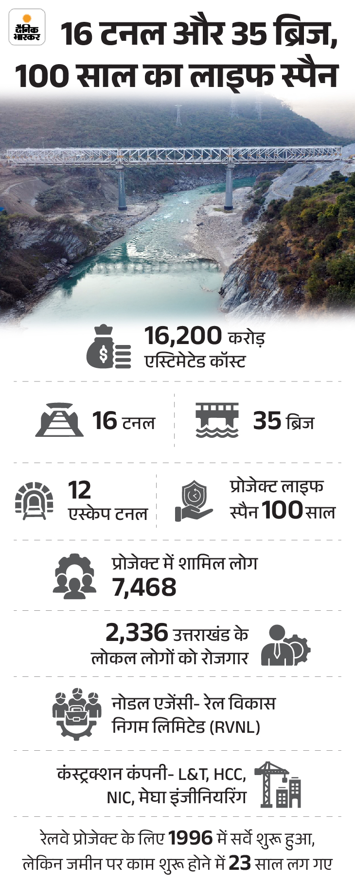 ‘नवंबर 2016 में इस रेल प्रोजेक्ट का डीटेल्ड एस्टीमेट, यानी लागत 16,200 करोड़ रुपए थी। हिमालय पर काम करने की चुनौतियों की वजह से लागत में इजाफा हुआ है। महंगाई और कोविड की वजह से भी समय और लागत बढ़ी है। अब फिर से बढ़ी हुई लागत का अंदाजा लगाया जा रहा है, अभी रिवाइज्ड एस्टीमेट की रिपोर्ट तैयार नहीं हुई है।’