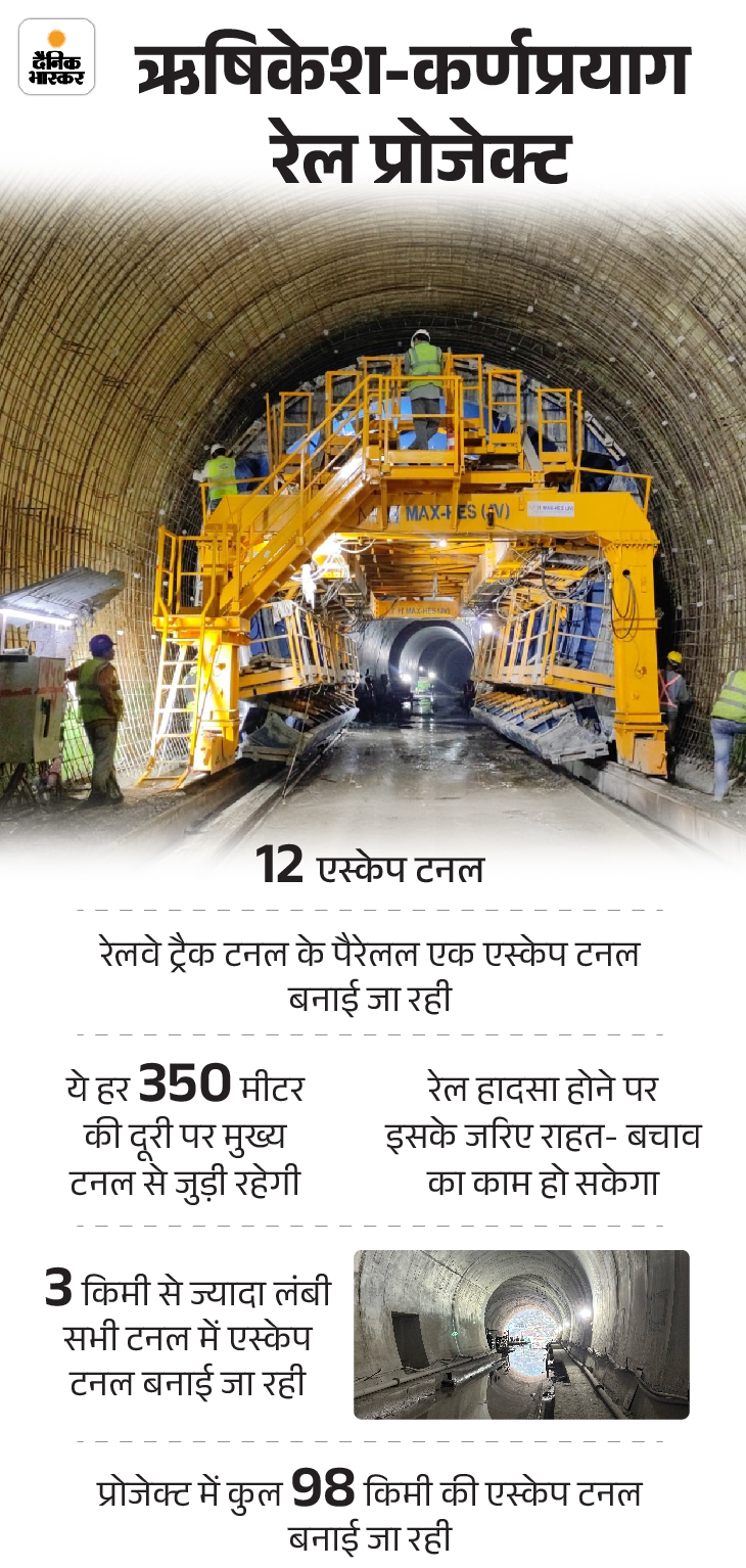ऋषिकेश-कर्णप्रयाग रेल प्रोजेक्ट के चीफ प्रोजेक्ट मैनेजर अजीत यादव बताते हैं, ‘रेल प्रोजेक्ट कुल 125 किमी का है। इसमें टनल की लंबाई 104 किमी है। कुल 16 टनल में से जिन टनल की लंबाई 3 किमी से ज्यादा है, उसमें हमने एस्केप टनल बनाई है। एस्केप टनल की टोटल लंबाई 98 किलोमीटर है। इस तरह प्रोजेक्ट में कुल टनल ड्रिलिंग की लंबाई 203 किलोमीटर है।‘