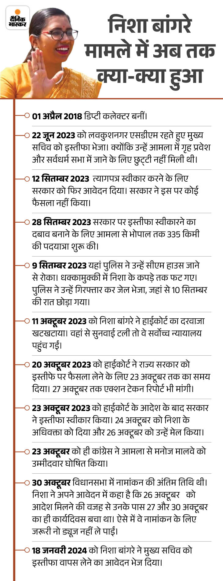 विधानसभा चुनाव लड़ने के लिए डिप्टी कलेक्टर की नौकरी से इस्तीफा देने वाली निशा बांगरे अब एक बार फिर नौकरी जॉइन करना चाहती हैं। उन्होंने मुख्य सचिव वीरा राणा को पत्र लिखकर इस्तीफा वापस लेने का अनुरोध किया है।