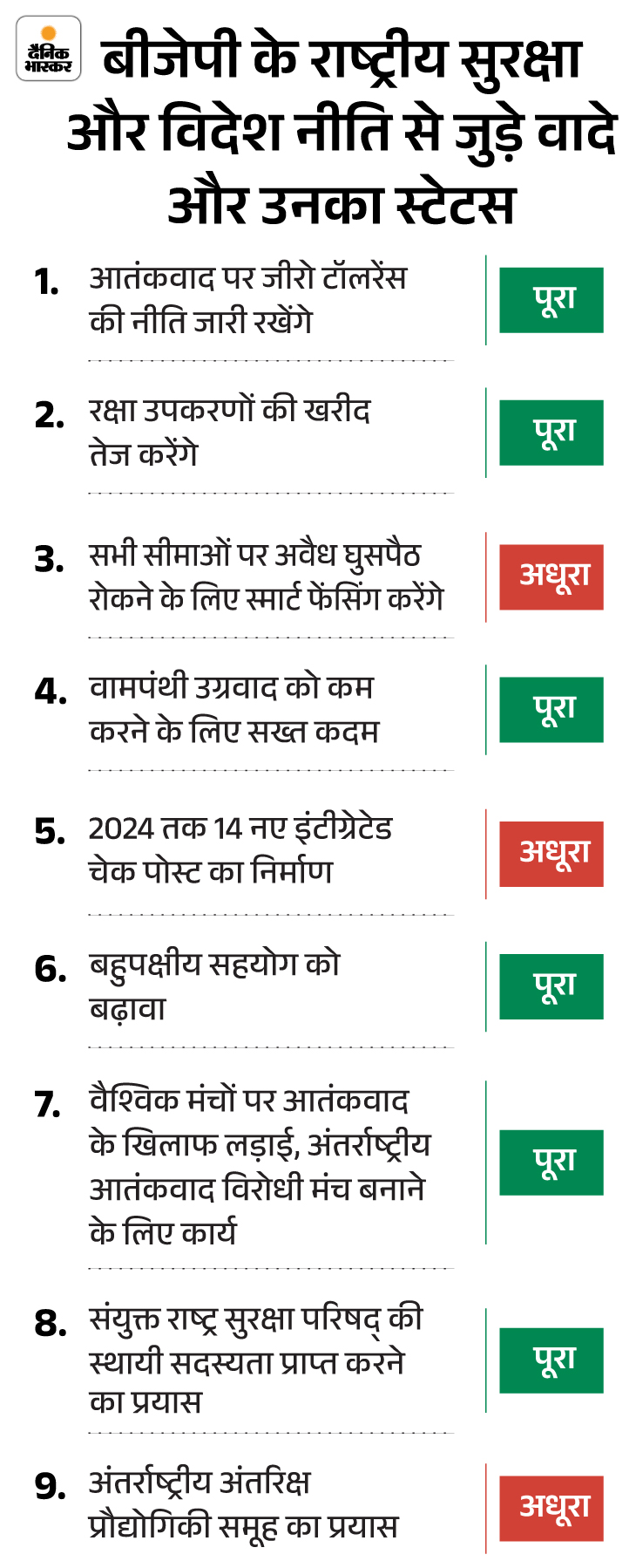 बीजेपी ने 2019 के 50 पेज के घोषणापत्र में राष्ट्रीय सुरक्षा और विदेश नीति से जुड़े 9 प्रमुख वादे किए थे, जिनमें से 6 वादे पूरे हुए हैं, जबकि 3 अधूरे हैं। इस तरह बीजेपी का स्ट्राइक रेट करीब 66% है। अधूरे वादों में से दो वादे सीमा सुरक्षा से जुड़े हुए हैं। इससे साफ है कि घुसपैठ और सीमा सुरक्षा से जुड़ी चुनौतियां अभी भी हैं। इस रिपोर्ट में राष्ट्रीय सुरक्षा और विदेश नीति से जुड़े सभी प्रमुख वादों की हालिया स्थिति जानेंगे…