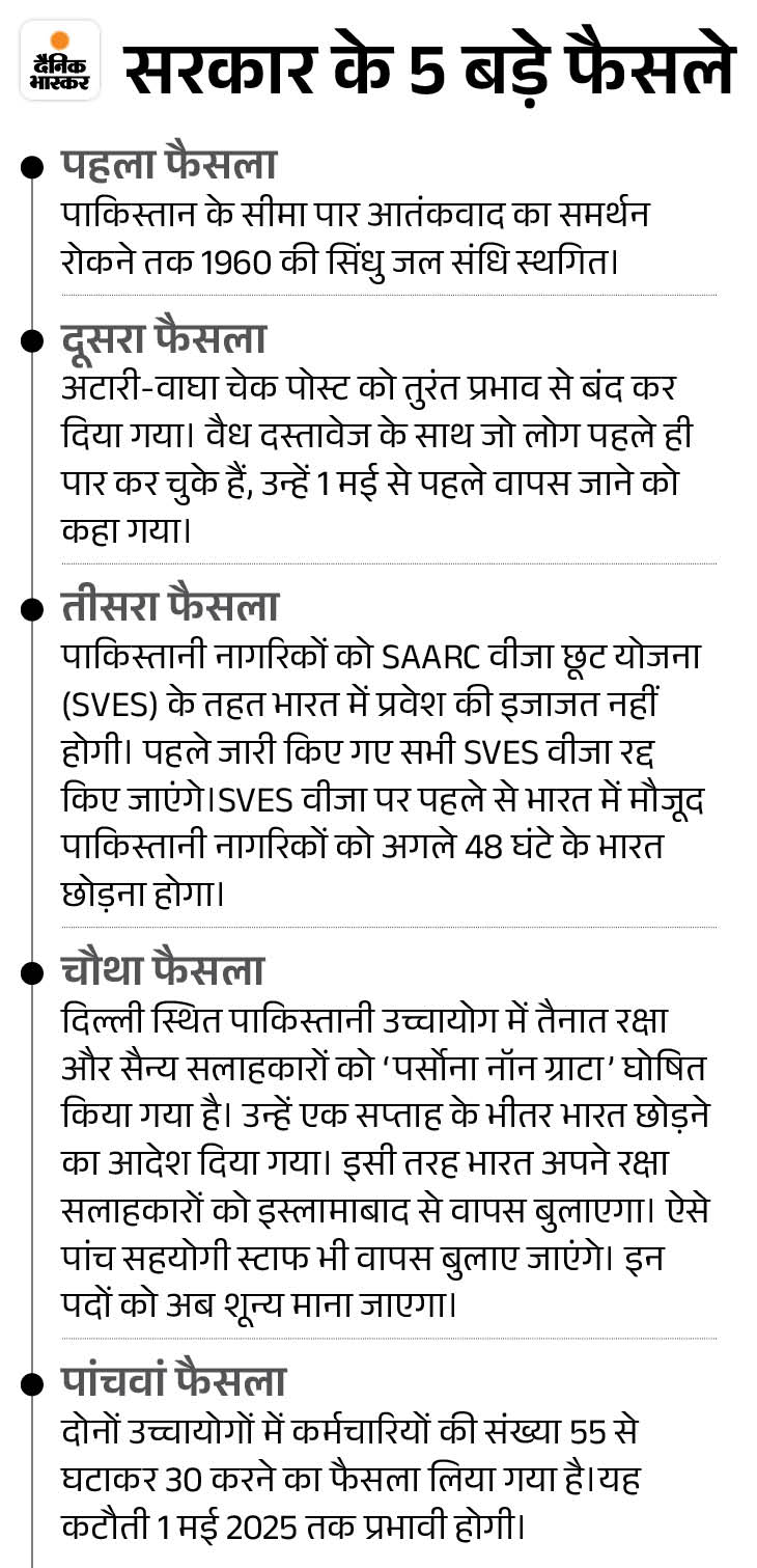 विदेश मंत्रालय ने कहा कि सभी पाकिस्तानी नागरिकों को भारत छोड़ना होगा, क्योंकि 27 अप्रैल से उनके वीजा रद्द कर दिए गए हैं। जिन्हें मेडिकल वीजा मिला है, उन्हें 29 अप्रैल 2025 तक भारत छोड़ना होगा।