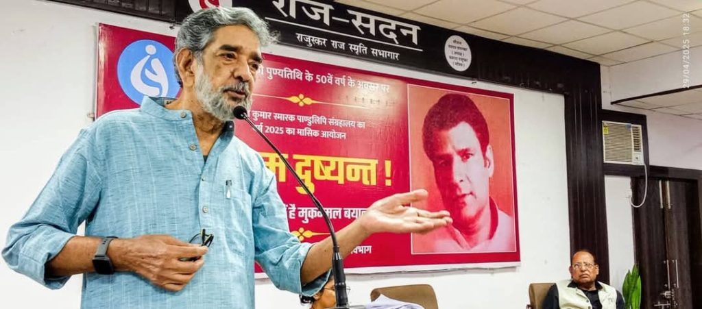 इस अवसर पर श्री राजेश जोशी ने कहा बहुत पहले कवि नामक एक पत्रिका निकलती थी जिसमें एक कवि और उस पर एक साहित्यकार की टिप्पणियां प्रकाशित की जाती थी ।इसी पत्रिका में दुष्यंत की कविताएं छपी थी जिस पर केदारनाथ सिंह जी की टिप्पणी प्रकाशित हुई थी। इस टिप्पणी में केदारनाथ जी ने कहा था कि दुष्यंत की कविताएं सबसे कम व्याख्या की मांग करती है ।उनकी कविताएं इतनी सीधी सरल, सहज होती है कि उन्हें किसी तरह की व्याख्या की आवश्यकता नहीं होती है ।दूसरा उनके कथ्य में उनका अपनापन अधिक मुखर होता है ।कवि की प्रतिबद्धताएं क्या है यह भी उनकी कविताओं से परिलक्षित होता है। दुष्यंत की कविताएं दूसरे सप्तक के बाद की कविताएं हैं और वे कलात्मक उपलब्धि के साथ सामने आती है ।उन्होंने यह भी कहा कि दुष्यंत को हम उल्टे तरीके से पढ़ते हैं यानी उर्दू की तरह दुष्यंत की पहले लोग गजलें पढ़ते हैं बाद में उनकी कविताएं और गद्य ,पर सच पूछा जाए तो दुष्यंत की कविताएं हो या ग़ज़ल उन सब में एक ही बेचैनी आपको देखने मिलती है ।उन्होंने यह भी कहा कि कमलेश्वर दुष्यंत के परम मित्र थे और सारिका में उनकी रचनाएं प्रकाशित कर उन्होंने दुष्यन्त को कालजयी रचनाकार बना दिया। उन्होंने यह भी बड़ी मजेदार किस्सा सुनाया कि जब मैंने एक शायर से पूछा कि शेर का वजन कैसे तोला जाता है तो उन्होंने बताया कि शेर का वजन कान से तोला जाता है। इसी तरह दोहे में सिर्फ मात्राएं होने से वह दोहा नहीं हो जाता है दोहे में आंतरिक लय होनी चाहिए ।