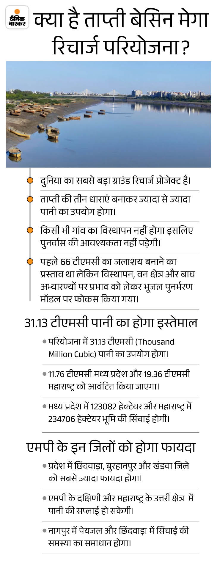 ताप्ती बेसिन मेगा रिचार्ज परियोजना से मध्यप्रदेश के 1 लाख 23 हजार 82 हेक्टेयर भू-क्षेत्र और महाराष्ट्र के 2 लाख 34 हजार 706 हेक्टेयर क्षेत्र में सिंचाई की स्थायी सुविधा उपलब्ध होगी। इस परियोजना से एमपी के बुरहानपुर एवं खंडवा जिले की बुरहानपुर, नेपानगर, खकनार एवं खालवा की कुल 4 तहसीलें लाभान्वित होंगी।