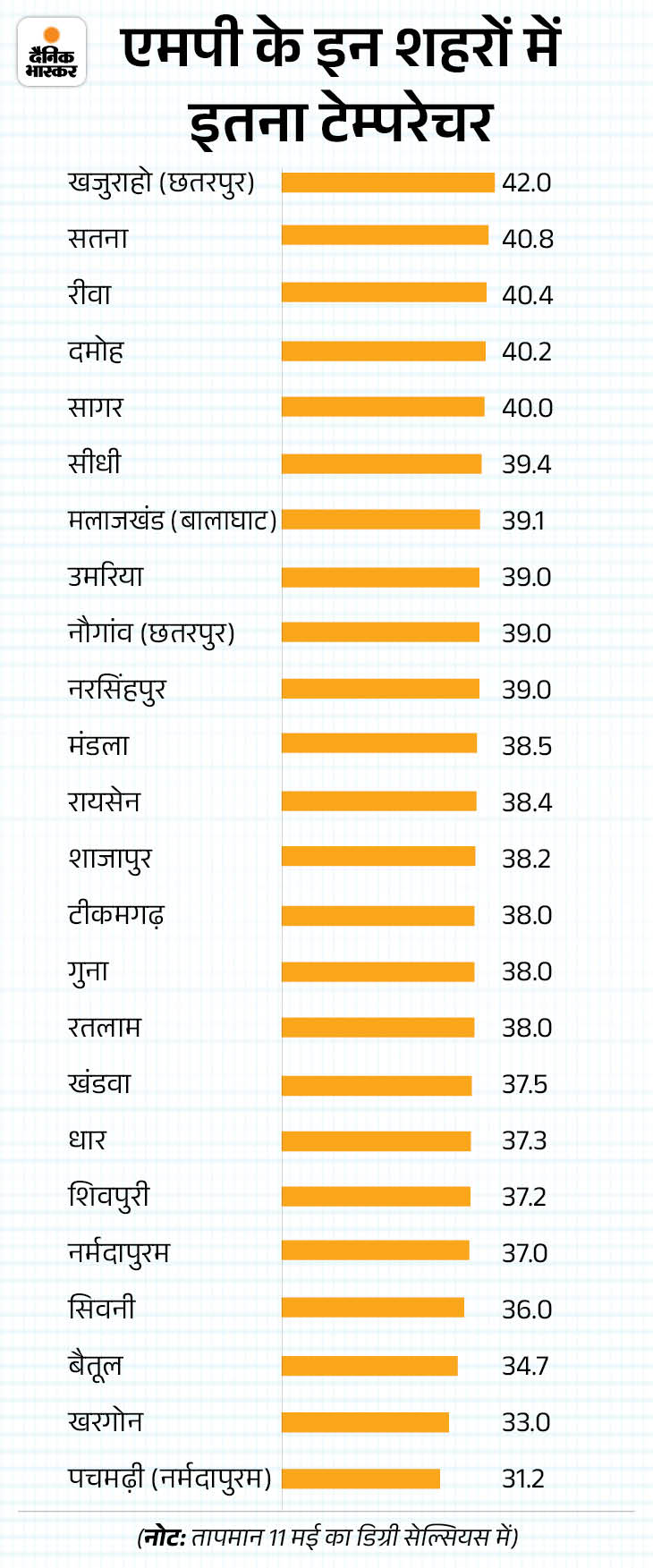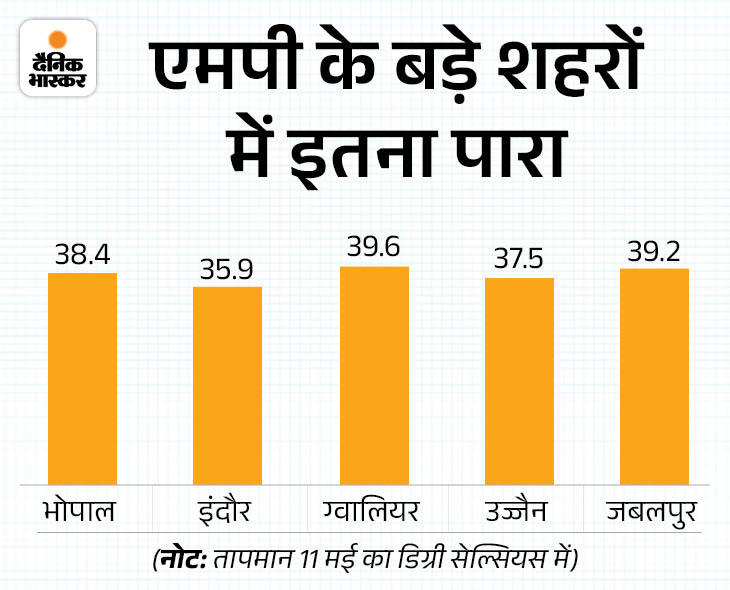 बड़े शहरों की बात करें तो भोपाल में 38.4 डिग्री, इंदौर में 35.9 डिग्री, ग्वालियर में 39.6 डिग्री, उज्जैन में 37.5 डिग्री और जबलपुर में 39.2 डिग्री सेल्सियस रहा। पचमढ़ी में सबसे कम 31.2 डिग्री सेल्सियस दर्ज किया गया।