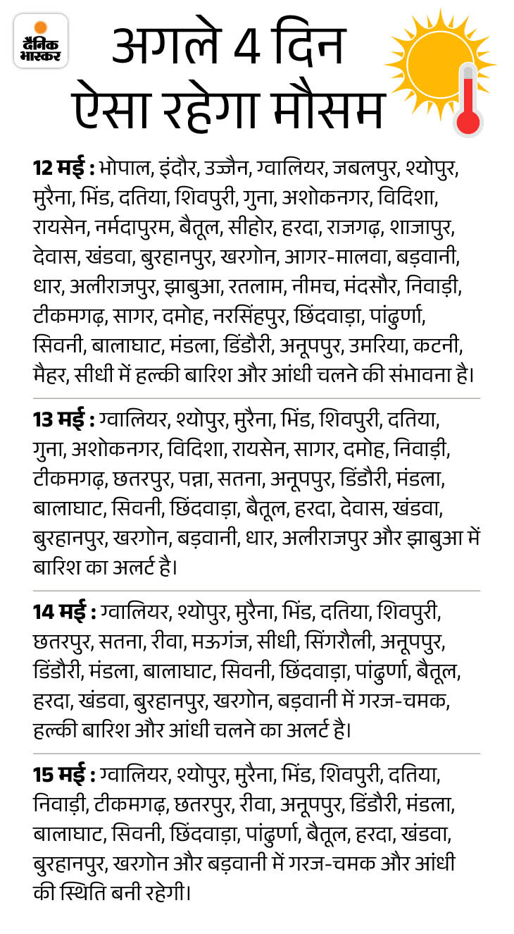 इन जिलों में सबसे ज्यादा गर्मी मौसम विभाग की मानें तो मई महीने में ग्वालियर, छतरपुर, नरसिंहपुर, निवाड़ी, मैहर, टीकमगढ़, भिंड, दतिया, खरगोन, बड़वानी, खंडवा, मुरैना, राजगढ़, रायसेन, शाजापुर, श्योपुरकलां, शिवपुरी और विदिशा जिलों में पारा 45 डिग्री या इससे ज्यादा रहने का अनुमान है। इनमें ग्वालियर-चंबल संभाग के साथ मालवा-निमाड़ के कुछ शहरों में भी तेज गर्मी रहेगी। छतरपुर के खजुराहो और नौगांव, निवाड़ी के पृथ्वीपुर में पारा 48 डिग्री सेल्सियस तक पहुंच सकता है।