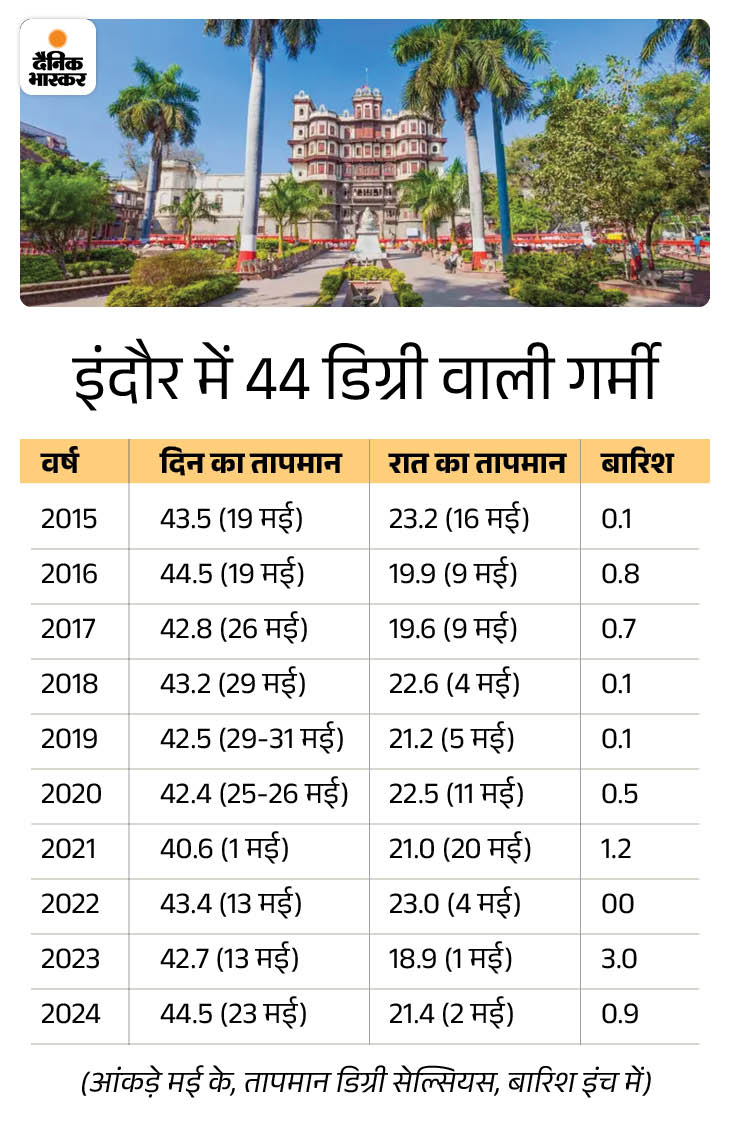 इंदौर में 3 इंच गिर चुका पानी मई के महीने में इंदौर में भी पारा 46 डिग्री के पार पहुंच चुका है। 31 मई 1994 को इतना तापमान दर्ज किया गया था। इस महीने यहां भी मौसम में बदलाव देखने को मिलता है। इसके चलते बादल छाए रहते हैं तो बौछारें भी गिरती हैं। 2023 में पूरे महीने 3 इंच बारिश हुई थी। वर्ष 2014 से 2023 के बीच 9 साल बारिश हो चुकी है। साल 2024 में भी तेज गर्मी रही थी। अधिकतम तापमान 44.5 डिग्री सेल्सियस तक पहुंच गया था। वहीं, बारिश का दौर भी चला था।