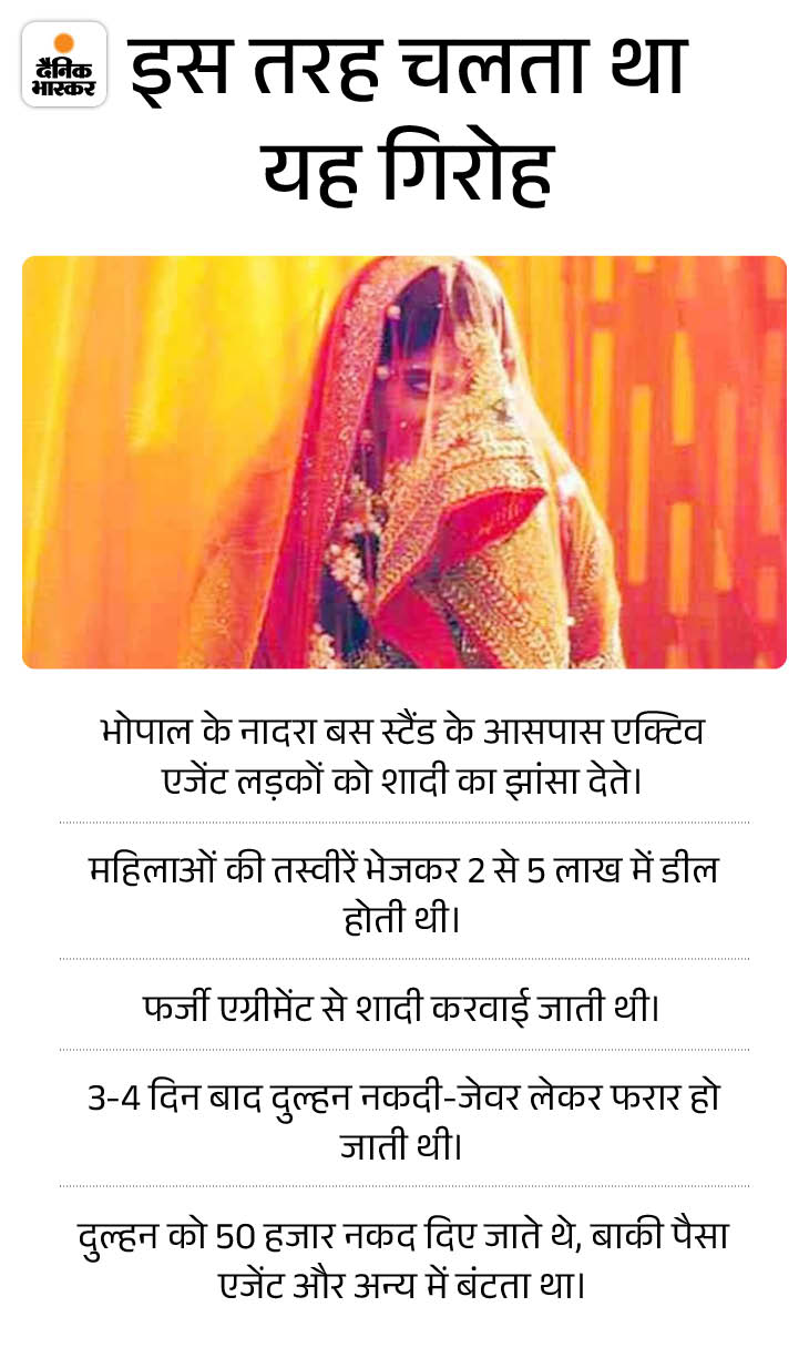 राजस्थान पुलिस ने मंगलवार को भोपाल में फर्जी शादियों के जरिए लोगों से लाखों रुपए की ठगी करने वाली अनुराधा को गिरफ्तार किया था। आरोपी अनुराधा पासवान अब तक करीब 25 लोगों से नकली शादी कर उन्हें ठग चुकी है। वह कई एजेंट्स के संपर्क में थी।