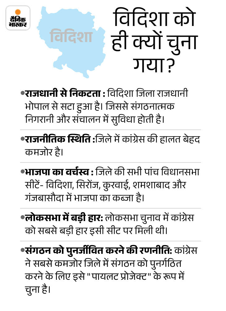 मध्यप्रदेश में राजनीतिक सूखे का सामना कर रही कांग्रेस अब संगठन को दुरुस्त करने के लिए केंद्रीय कृषि मंत्री शिवराज सिंह चौहान के गढ़ विदिशा से पायलट प्रोजेक्ट शुरू करने जा रही है। 22 मई से एमपी कांग्रेस के करीब 100 नेता विदिशा जिले की सभी ग्राम पंचायतों और वार्डों में जाएंगे। यह पूरा पायलट प्रोजेक्ट करीब 20 दिन तक चलेगा।