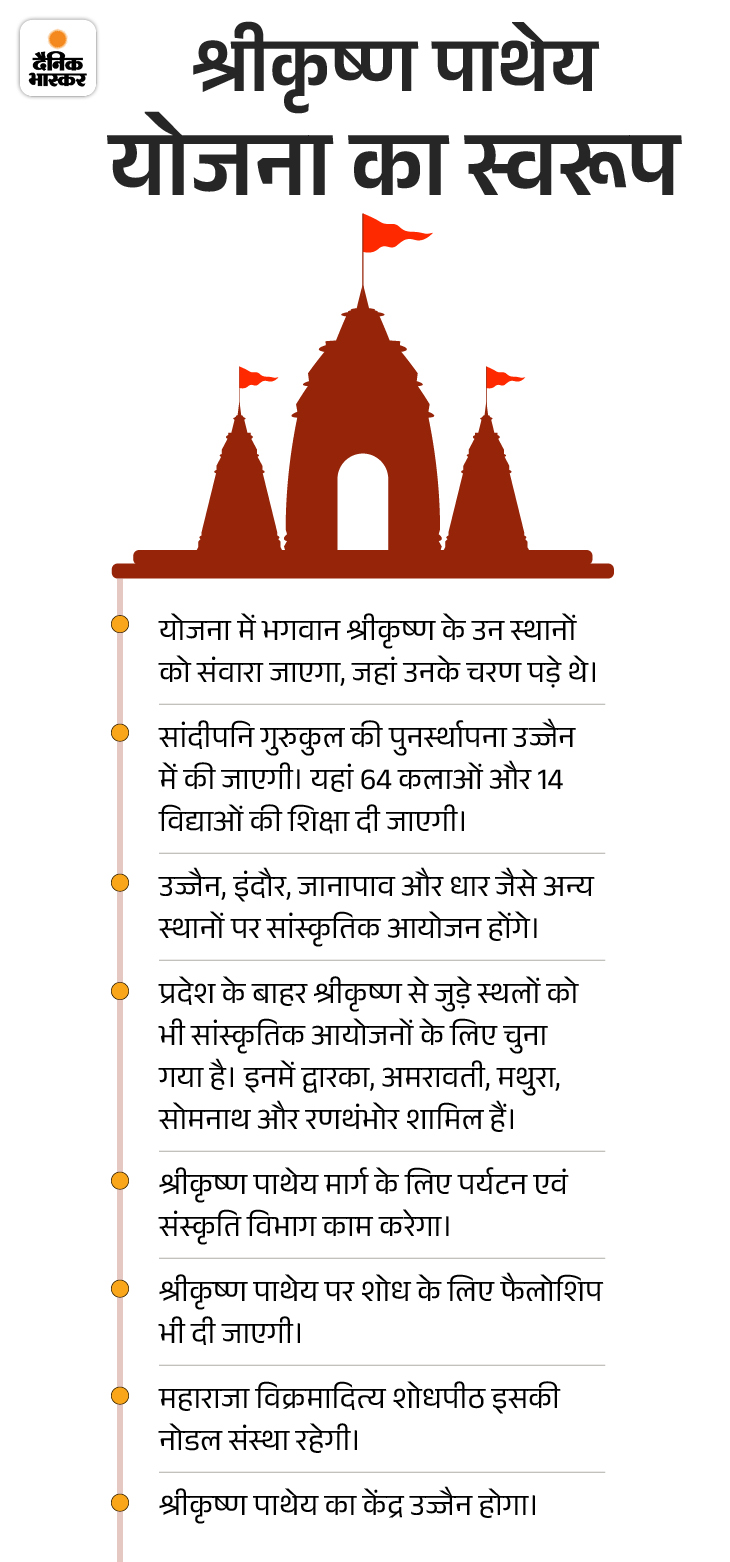 मोहन कैबिनेट पहले ही इस योजना को मंजूरी दे चुकी है। ऐसे में संस्कृति विभाग को श्रीकृष्ण पाथेय न्यास का रजिस्ट्रेशन जल्द कराने और न्यास को एक्टिव करने के निर्देश भी दिए जा चुके हैं। मुख्यमंत्री डॉ मोहन यादव ने कहा है कि शुरुआत में एमपी और राजस्थान की एक डिटेल कार्ययोजना तैयार की जाए और श्रीकृष्ण पाथेय योजना को अमल में लाने के लिए दोनों ही राज्यों के विद्वानों की एक जाइंट कमेटी द्वारा प्रस्तावित मार्ग तय किए जाएं, जहां से होकर भगवान कृष्ण का आना जाना हुआ है।