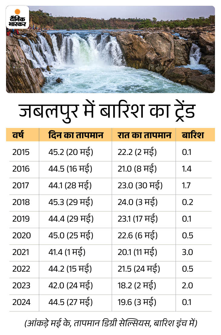 जबलपुर में तेज गर्मी का ट्रेंड, इस बार बारिश जबलपुर की बात करें, तो यहां मई में पारा 46.7 डिग्री तक पहुंच चुका है। 25 मई 1954 को इतना टेम्प्रेचर रिकॉर्ड किया गया था। पिछले 10 साल में 3 बार टेम्प्रेचर 45 डिग्री से अधिक रहा। मई में बारिश का ट्रेंड भी रहता है। 2014 से 2023 में हर साल बारिश हुई है।