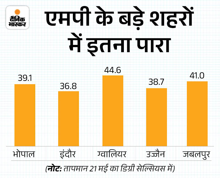 बड़े शहरों की बात करें तो ग्वालियर में सबसे ज्यादा 44.6 डिग्री, भोपाल में 39.1 डिग्री, इंदौर में 36.8 डिग्री, जबलपुर में 41 डिग्री और उज्जैन में पारा 38.7 डिग्री सेल्सियस रहा।