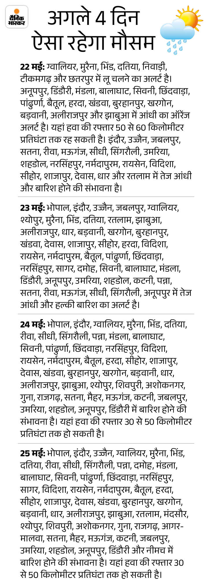 वहीं, अनूपपुर, डिंडौरी, मंडला, बालाघाट, सिवनी, छिंदवाड़ा, पांढुर्णा, बैतूल, हरदा, खंडवा, बुरहानपुर, खरगोन, बड़वानी, अलीराजपुर और झाबुआ में आंधी का ऑरेंज अलर्ट है। इन जिलों में हवा की रफ्तार 60 किलोमीटर प्रतिघंटा तक रह सकती है।
