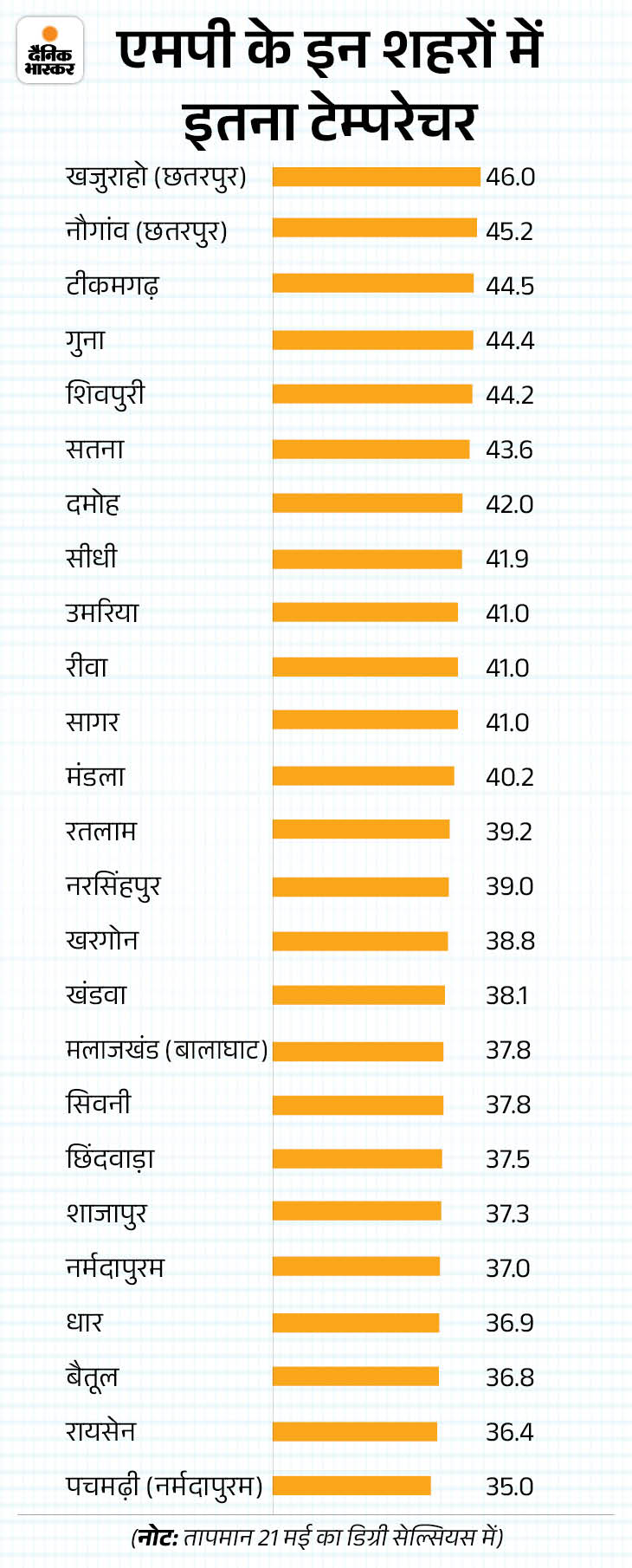 इधर, छतरपुर प्रदेश का सबसे गर्म जिला रहा। खजुराहो में पारा 46 डिग्री और नौगांव में 45.2 डिग्री सेल्सियस दर्ज किया गया। टीकमगढ़ में 44.5 डिग्री, गुना में 44.4 डिग्री, शिवपुरी में 44.2 डिग्री, सतना में 43.6 डिग्री, दमोह में 42 डिग्री, सीधी में 41.9 डिग्री, उमरिया, रीवा-सागर में 41 डिग्री और मंडला में 40.2 डिग्री दर्ज किया गया।