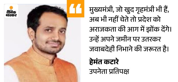 कटारे बोले-कानून व्यवस्था पूरी तरह चरमरा चुकी एमपी विधानसभा में उप नेता प्रतिपक्ष हेमंत कटारे ने सोशल मीडिया प्लेटफॉर्म X पर लिखा- मध्यप्रदेश में कानून व्यवस्था पूरी तरह चरमरा चुकी है। मुरैना जैसे संवेदनशील जिले में दिनदहाड़े सरेआम गोलीबारी की घटना कोई सामान्य बात नहीं, यह सरकार की नाकामी का प्रतीक है।