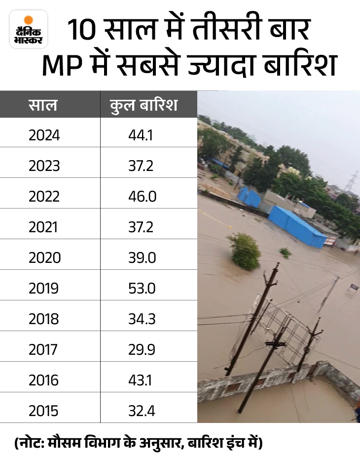 सबसे ज्यादा पानी साल 2019 में 53 इंच हुई थी। 2021 और 2023 में सामान्य से थोड़ी ही कम बारिश हुई थी। इस तरह कह सकते हैं कि पिछले 6 साल से प्रदेश में अच्छी बरसात हो रही है। अगर मौसम विभाग का इस साल का अनुमान सटीक बैठता है तो लगातार 7वें साल प्रदेश में सामान्य से ज्यादा बारिश होगी।