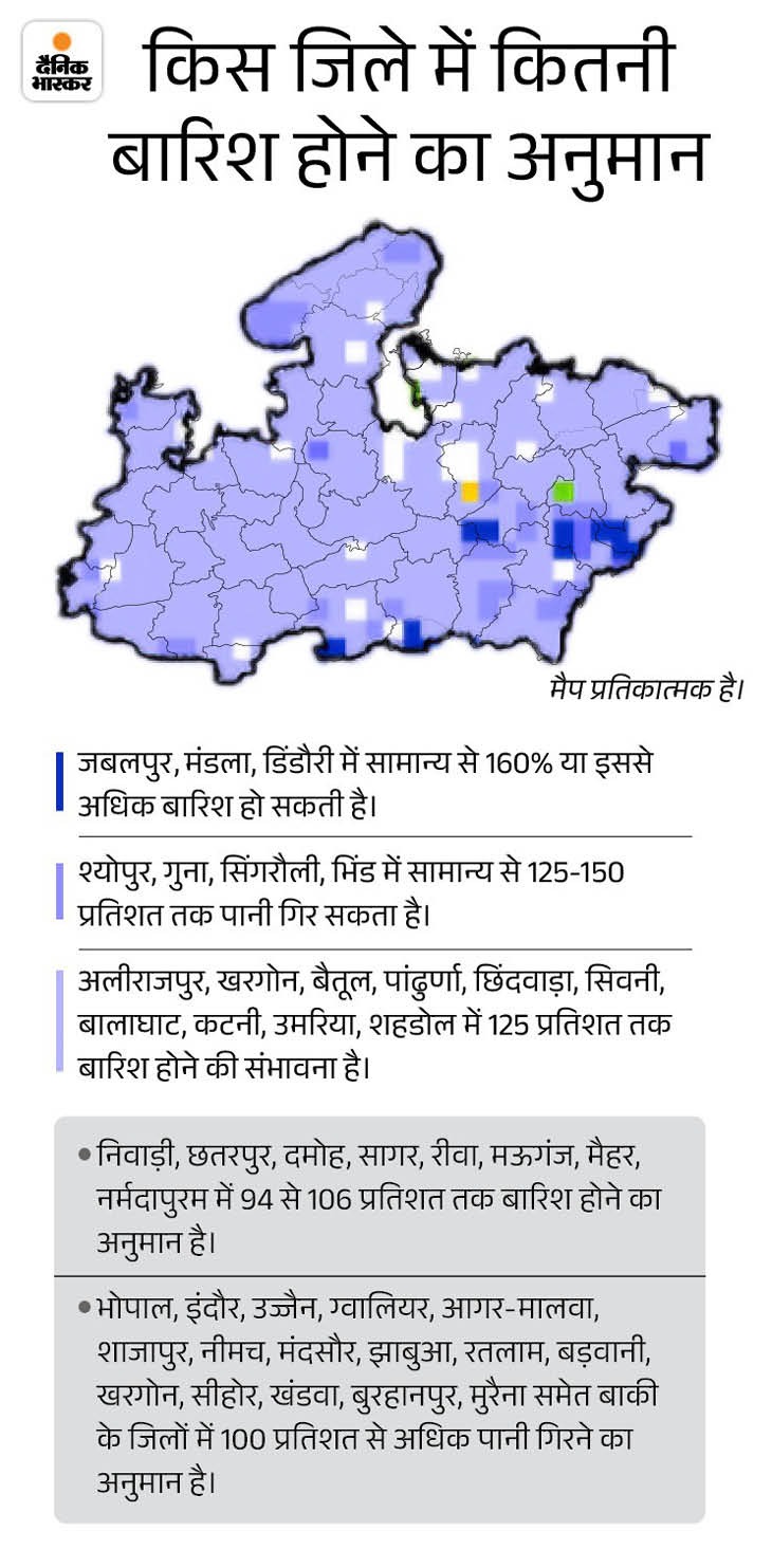 बारिश के सामान्य से बेहतर रहने की उम्मीद प्रदेश में इस बार मानसून के सामान्य से बेहतर रहने की उम्मीद जताई जा रही है। अनुमान के मुताबिक 104 से 106% यानी औसत 38-39 इंच बारिश हो सकती है। जबलपुर-शहडोल संभाग में सबसे ज्यादा पानी गिरेगा। ग्वालियर, चंबल, इंदौर, उज्जैन और भोपाल संभाग में भी कोटा फुल हो सकता है।