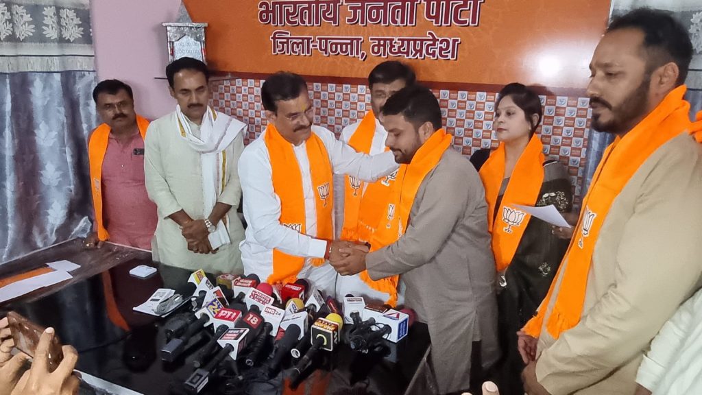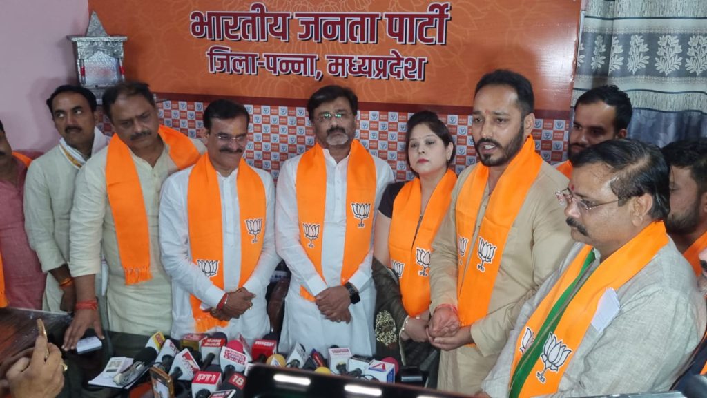 भारतीय जनता पार्टी जिला कार्यालय पन्ना में भारतीय जनता पार्टी के प्रदेश अध्यक्ष व खजुराहो सांसद श्री विष्णुदत्त शर्मा के समक्ष कांग्रेस के जिलाध्यक्ष, कार्यवाहक जिला अध्यक्ष, युवक कांग्रेस के प्रदेश प्रवक्ता, प्रदेश सचिव, जिला महामंत्री सहित कई पदाधिकारियों ने पार्टी की सदस्यता ग्रहण की। सदस्यता ग्रहण करने वालों में कटनी कांग्रेस जिला अध्यक्ष श्री विक्रम खम्परिया, कार्यवाहक जिलाध्यक्ष व उद्योगपति श्री रौनक खंडेलवाल, मध्यप्रदेश युवा कांग्रेस की प्रदेश प्रवक्ता एवं कटनी महापौर प्रत्याशी श्रीमती श्रेया खण्डेलवाल, युवा कांग्रेस के प्रदेश सचिव श्री अंकित सिंघानिया, जिला महामंत्री श्री मुकेश पाठक एवं युवा कांग्रेस के जिला उपाध्यक्ष श्री आकाश तिवारी सहित 100 से अधिक कांग्रेस कार्यकर्ताओं ने भारतीय जनता पार्टी की सदस्यता ग्रहण की। प्रदेश अध्यक्ष श्री शर्मा ने पार्टी का अंगवस्त्र पहनाकर सभी का स्वागत किया।