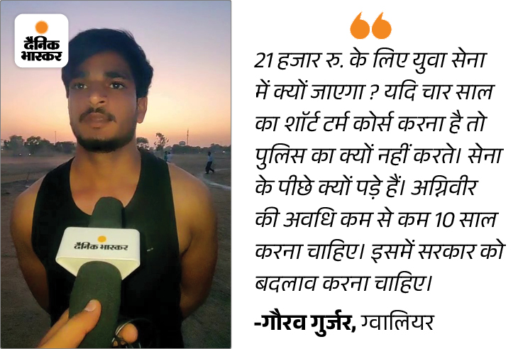 सेना भर्ती की तैयारी कर रहे गौरव सिंह गुर्जर कहते हैं, मैं सेना की तैयारी तो कर रहा हूं, लेकिन मेरे दोस्त तैयारी नहीं कर रहे हैं। गौरव का कहना है कि मैं खुद प्रैक्टिस के साथ पढ़ाई भी कर रहा हूं, क्योंकि चार बाद नौकरी चली गई तो अगली नौकरी के लिए पढ़ाई भी जरूरी है।