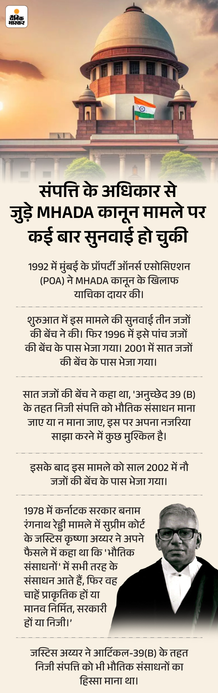 MHADA कानून में 1986 में एक संशोधन हुआ था, जिसके तहत सरकार को किसी व्यक्ति की निजी संपत्ति अधिग्रहित करने का अधिकार मिल गया। इस संशोधन में ये भी कहा गया कि ये कानून आर्टिकल-39 (बी) को लागू करने के लिए बनाया गया है। इस संशोधन के खिलाफ दायर की गई याचिकाओं पर सुनवाई कर रही सुप्रीम कोर्ट को अब यह तय करना है कि किसी व्यक्ति की निजी संपत्ति को आम लोगों की भलाई के लिए सरकार अपने कब्जे में ले सकती है या नहीं।