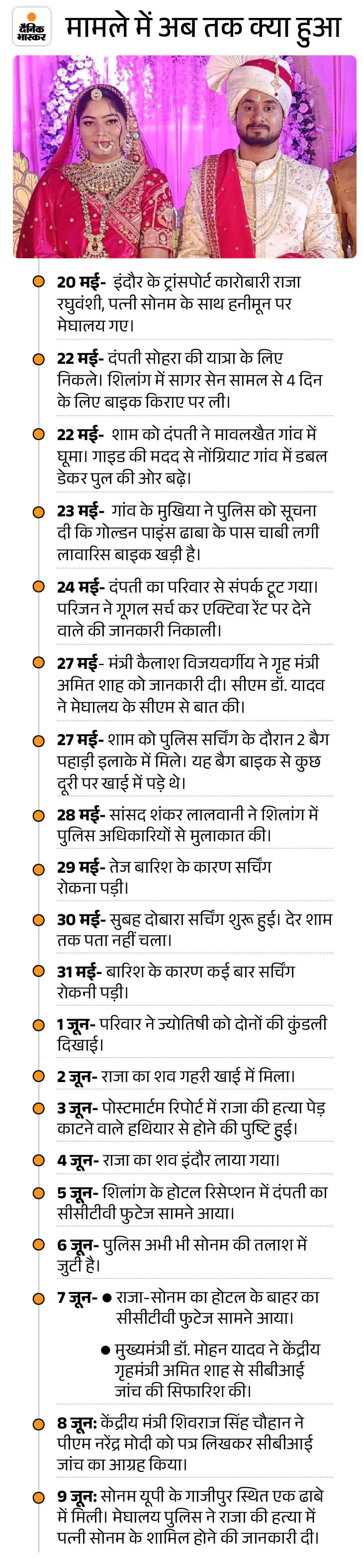 इंदौर के ट्रांसपोर्ट कारोबारी राजा रघुवंशी की हत्या के बाद लापता उनकी पत्नी 17 दिन बाद यूपी के गाजीपुर में एक ढाबे पर बेहोश मिलीं। इसके बाद मेघालय डीजीपी आई नोंगरांग ने दावा किया कि पत्नी (सोनम) ने ही पेशेवर हत्यारों को सुपारी देकर मर्डर कराया था।