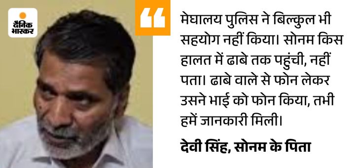पिता बोले- शिलांग पुलिस झूठ बोल रही सोनम के पिता देवी सिंह बोले- शिलांग पुलिस झूठ बोल रही है। वह इस मामले में फंसने वाली है इसलिए ऐसा कर रही है। हमारे बच्चे ऐसा नहीं कर सकते। उन्हें ऐसी शिक्षा नहीं दी गई है। मेरी बेटी 25 साल की है, कोई 10 साल की नहीं।