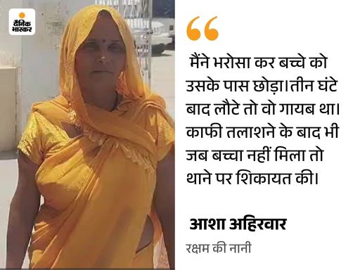 नानी बोली- अनजान युवक पर भरोसा भारी पड़ गया नानी आशा अहिरवार ने बताया कि जयपुर स्टेशन के बाहर पुलिस से सिंधी कैंप का पता पूछा। तभी वहां आरोपी आया। उसने पूछा कि दीदी क्या आप लोग खाटूश्याम जी पहली बार जा रहे हैं। मैंने हां में जवाब दिया। इसके बाद वो भी हमारे साथ चलने लगा। सिंधी कैंप से खाटू श्याम के लिए रवाना हुए। 7 जून की सुबह वहां पहुंचे। वहां पहुंचने के बाद शासकीय सुलभ कॉम्प्लेक्स में फ्रेश होने गए। इस दौरान आरोपी हमारे आसपास ही रहा। वो भी वहीं नहाया। मैं, मेरी बेटी ललिता और बेटा रक्षम तैयार हो चुके थे। तब आरोपी बोला कि मैं तो हर ग्यारस को यहां आता हूं। आपको मैं घुमा देता हूं। मंदिर की पूरी परिक्रमा में वह साथ रहा। खाटू श्याम जी के एंट्री गेट पर पहुंचते ही आरोपी बोला कि आप लोग दर्शन कर आओ। मैं यहां आता रहता हूं। अंदर समय लगेगा। बच्चा बीमार है। इसे मेरे पास ही छोड़ जाओ।