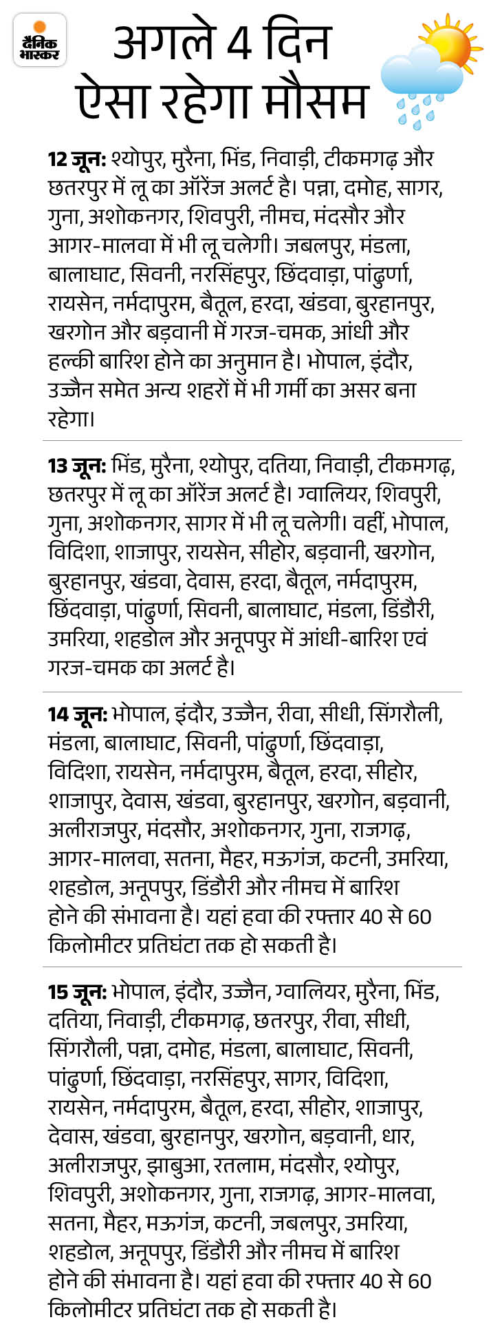 अगले 2 दिन लू का अलर्ट मौसम विभाग ने अगले 2 दिन यानी, 12 और 13 जून को ग्वालियर, चंबल, उज्जैन और सागर संभाग के जिलों में लू का अलर्ट जारी किया है। 14 जून से फिर से बारिश का दौर शुरू हो जाएगा। 15 जून को पूरे प्रदेश में बारिश का अलर्ट है। इसी दौरान मानसून की एंट्री भी प्रदेश में हो जाएगी।