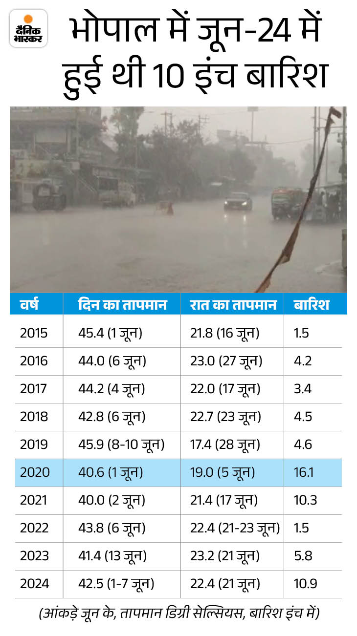 भोपाल में 15 जून तक तेज गर्मी राजधानी में जून महीने में तेज गर्मी और बारिश दोनों का ही ट्रेंड है। पिछले 10 साल में 15 जून से पहले तेज गर्मी का असर रहा। 4 साल तो टेम्प्रेचर 45 डिग्री के पार पहुंच गया। वहीं, रात का टेम्प्रेचर 17.4 डिग्री तक आ गया। साल 2020 में सबसे ज्यादा 16 इंच बारिश हुई थी।