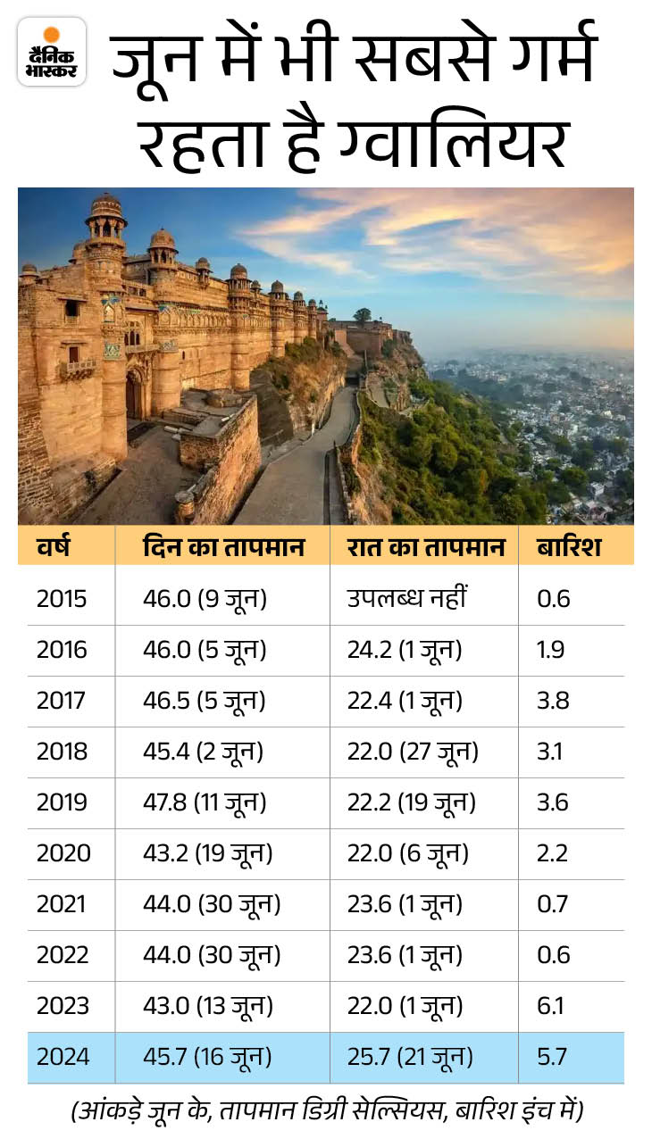 ग्वालियर में 47 डिग्री पार हो चुका टेम्प्रेचर ग्वालियर में मई के बाद जून भी तेज गर्मी रहती है। 10 साल के आंकड़ों की बात करें तो साल 2019 में अधिकतम तापमान 47.8 डिग्री तक पहुंच चुका है। वहीं, 2024 में पारा 45.7 डिग्री दर्ज किया गया था। इस महीने अमूमन तापमान 45 से 46 डिग्री ही रहता है।