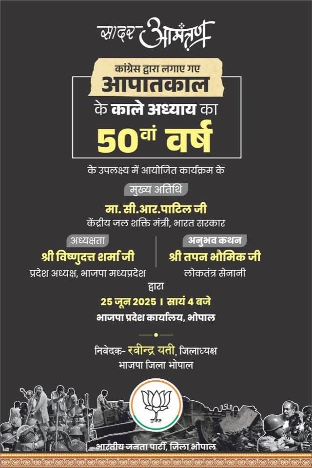 कांग्रेस द्वारा लगाए गए आपातकाल के काले अध्याय के 50वां वर्ष के उपलक्ष्य में केंद्रीय मंत्री मा. सी.आर.पाटिल जी केंद्रीय जल शक्ति मंत्री, भारत सरकार, श्री विष्णुदत्त शर्मा जी प्रदेश अध्यक्ष, भाजपा मध्यप्रदेश एवं श्री तपन भौमिक जी लोकतंत्र सेनानी जी की गरिमामय उपस्थिति में 25 जून 2025, सायं 4 बजे भाजपा प्रदेश कार्यालय, भोपाल आयोजित कार्यक्रम में आप सभी लोकतंत्र प्रहरी सादर आमंत्रित हैं।