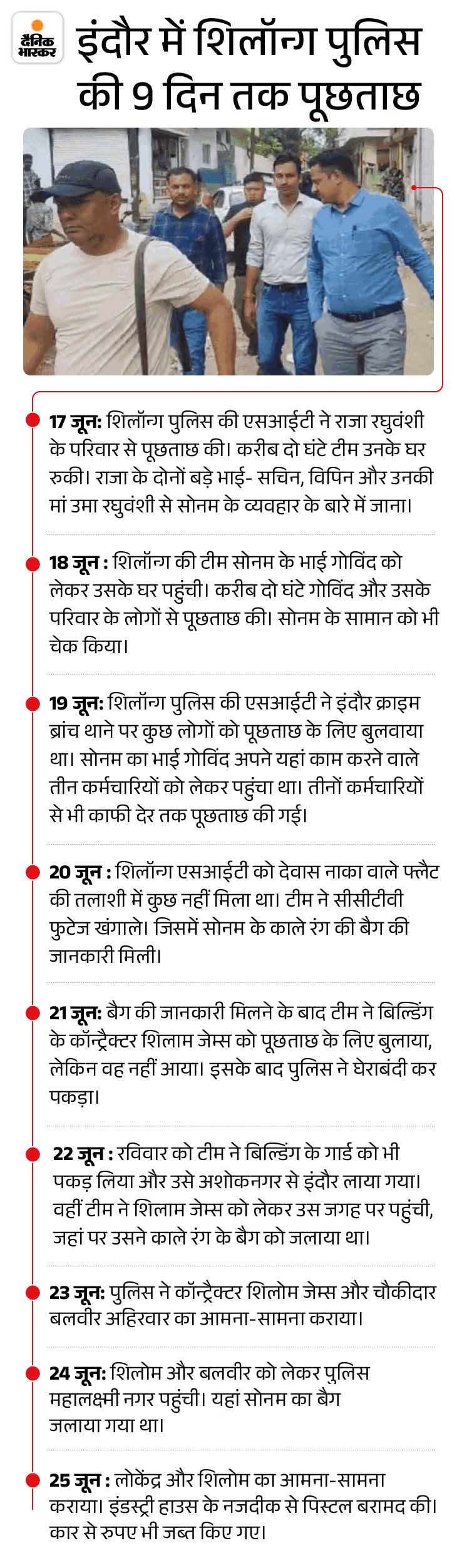 राजा रघुवंशी हत्याकांड की जांच कर रही मेघालय पुलिस बुधवार (25 जून) को इंदौर से शिलॉन्ग लौट गई। टीम यहां 9 दिन रही। शिलॉन्ग पुलिस अपने साथ उस बिल्डिंग के मालिक लोकेंद्र सिंह तोमर, ब्रोकर-कॉन्ट्रैक्टर शिलोम जेम्स और सिक्योरिटी गार्ड बलवीर अहिरवार को भी ले गई है, जिसके एक फ्लैट में सोनम रुकी थी।