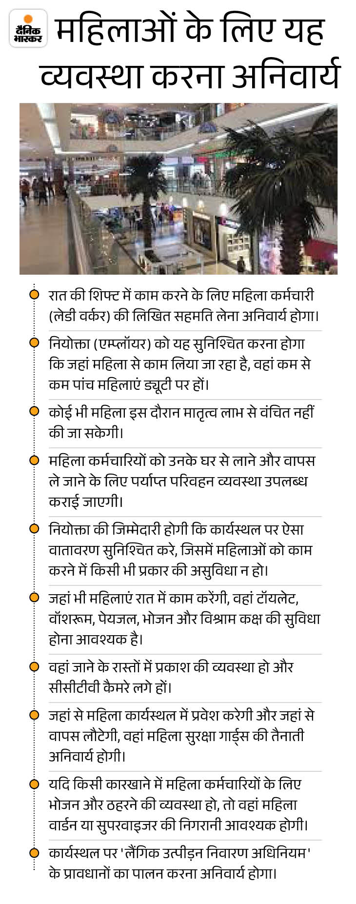 दुकान और स्थापना अधिनियम, 1958 में किए गए संशोधन के आधार पर श्रम विभाग ने निर्देश जारी किए हैं कि रात 9 बजे से सुबह 7 बजे तक महिलाएं काम कर सकेंगी। जहां महिलाएं रात में काम करेंगी, उस शॉप या शोरूम में कम से कम 10 या अधिक महिलाएं नियुक्त होनी चाहिए।