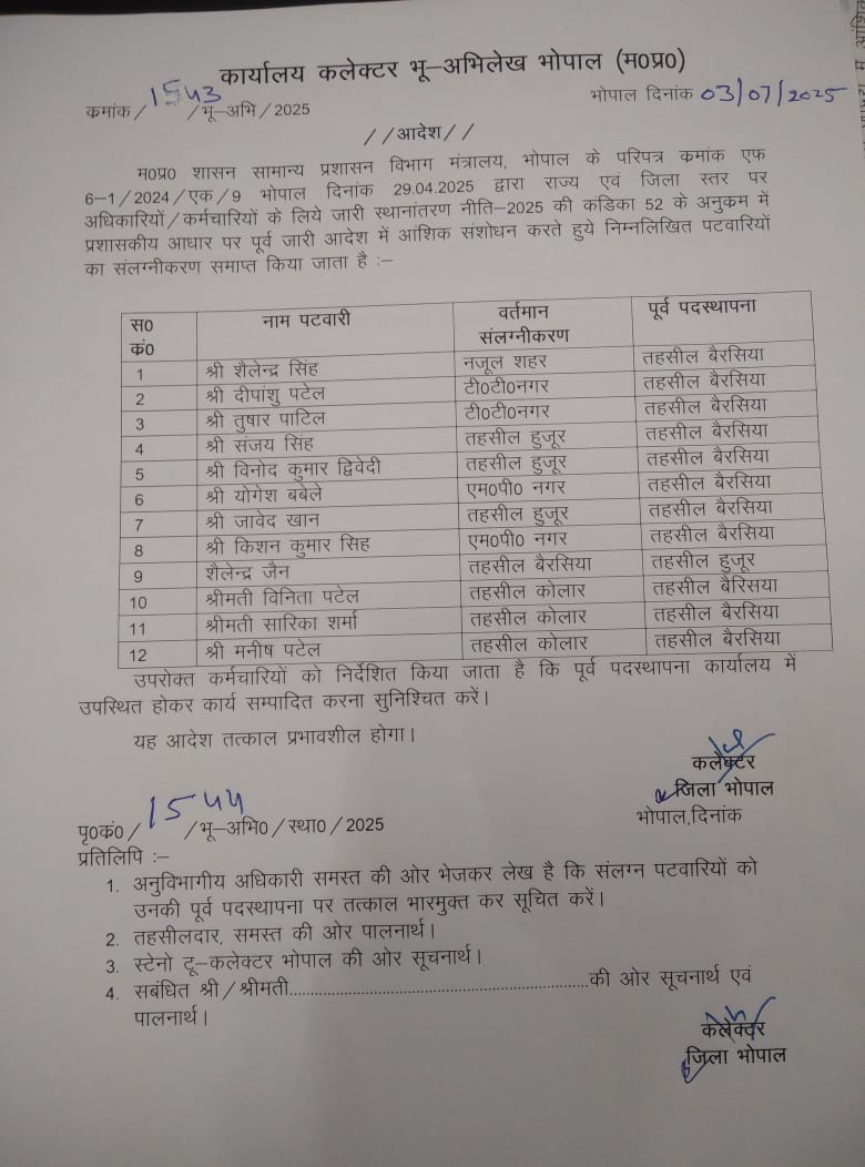 इन पटवारियों के अटैचमेंट खत्म किए कलेक्टर सिंह ने 12 पटवारियों के अटैचमेंट खत्म किए हैं। इनमें शैलेंद्र सिंह को नजूल शहर से बैरसिया, दीपांशु पटेल को टीटी नगर से बैरसिया, तुषार पाटिल को टीटी नगर से बैरसिया, संजय सिंह को हुजूर से बैरसिया, विनोद कुमार द्विवेदी को हुजूर से बैरसिया, योगेश बबेले को एमपी नगर से बैरसिया, जावेद खान को हुजूर से बैरसिया, किशन कुमार सिंह को एमपी नगर से बैरसिया, शैलेंद्र जैन को बैरसिया से हुजूर, विनिता पटेल को कोलार से बैरसिया, सारिका शर्मा को कोलार से बैरसिया और मनीष पटेल को कोलार से बैरसिया भेजा गया है।