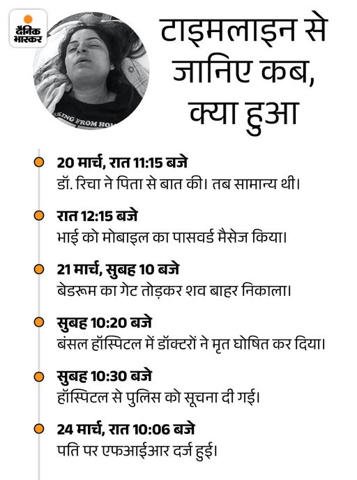 सुसाइड वाले दिन पति ने कहा- साथ में डिनर किया रिचा की लाश मिलने के बाद पति अभिजीत पांडे ने कहा था कि बैक पैन की शिकायत के चलते वह 20 मार्च की रात अलग कमरे में सोया था। इससे पहले रिचा के साथ डिनर किया था। 21 मार्च को सुबह जब रिचा के कमरे का गेट नहीं खुला तब मजदूरों को बुलाकर गेट को तुड़वाया।