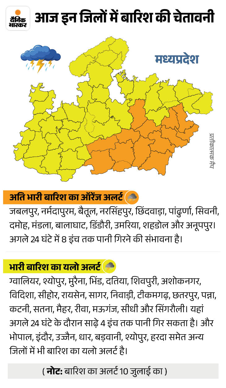 मध्यप्रदेश में मानसूनी बारिश से मंडला, नरसिंहपुर, उमरिया, शिवपुरी, जबलपुर, रीवा, शहडोल-सागर के साथ ग्वालियर संभाग के कई जिलों में बाढ़ के हालात हैं। आज गुरुवार को 14 जिलों में अति भारी और 22 जिलों में भारी बारिश होने का अलर्ट है।