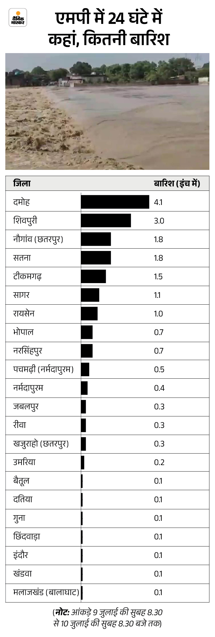 प्रदेश के सभी जिलों में पिछले 24 घंटे के दौरान आंधी और बारिश का दौर रहा। सबसे ज्यादा बारिश दमोह में 4.1 इंच हो गई। शिवपुरी में 3 इंच, नौगांव-सतना में 1.8 इंच, टीकमगढ़ में डेढ़ इंच, सागर में 1.1 इंच और रायसेन में 1 इंच बारिश दर्ज की गई। भोपाल में रात में बारिश हुई, जो आधा इंच से ज्यादा रही।