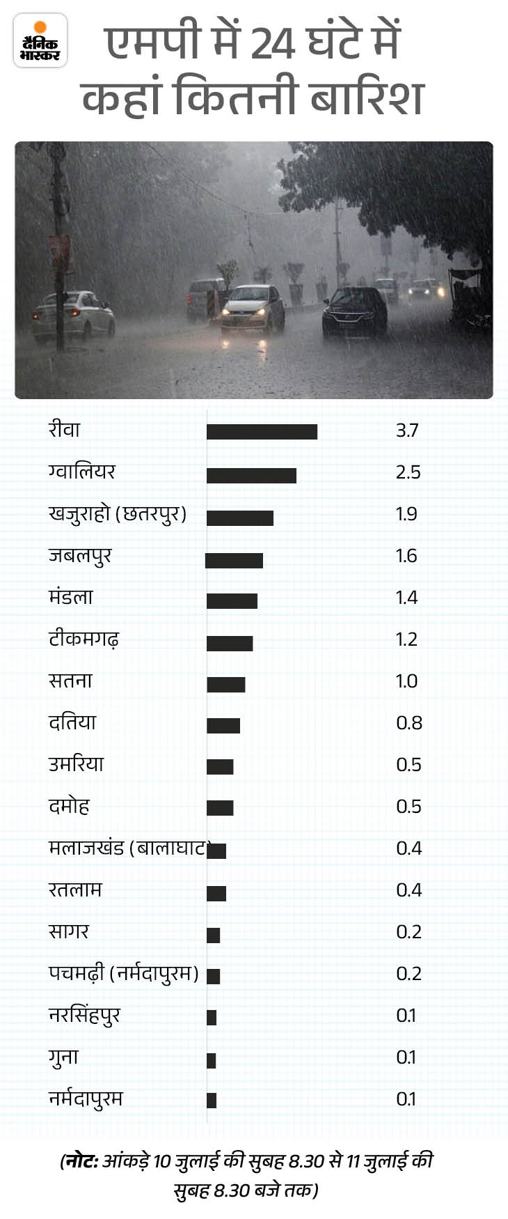 बीते 24 घंटे के दौरान रीवा में सबसे ज्यादा 3.7 इंच पानी गिर गया। ग्वालियर में भी भारी बारिश दर्ज की गई। यहां ढाई इंच पानी गिरा। छतरपुर के खजुराहो में 1.9 इंच, जबलपुर में 1.6 इंच, मंडला में 1.4 इंच, टीकमगढ़ में 1.2 इंच और सतना में 1 इंच बारिश हुई। दतिया, उमरिया, दमोह, बालाघाट, रतलाम, सागर, नर्मदापुरम, नरसिंहपुर, गुना, मऊगंज, सीहोर समेत कई जिलों में भी बारिश का दौर जारी रहा।