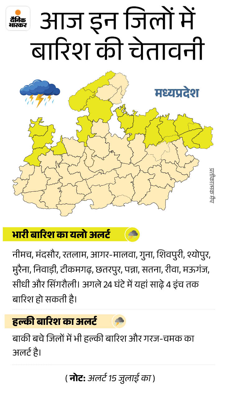 प्रदेश में 16 जून से मानसून एंटर हुआ था। तभी से तेज बारिश का दौर चल रहा है। इस वजह से कोटे की आधी यानी औसत 18 इंच बारिश हो चुकी है। निवाड़ी में तो 103% तक पानी गिर चुका है। मंडला, टीकमगढ़ में भी बारिश का कोटा 75% तक फुल हो गया है। अगले 4 दिन यानी 18 जुलाई तक तेज बारिश का दौर चलेगा।