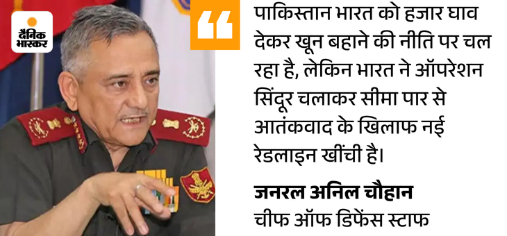 3 जून को कहा था- PAK की प्लानिंग 8 घंटे में फेल हुई CDS जनरल चौहान ने 3 जून को पुणे यूनिवर्सिटी में ‘भविष्य के युद्ध और युद्ध’ विषय पर लेक्चर में कहा था, ’10 मई रात पाकिस्तान ने भारत को 48 घंटे में घुटने पर लाने की प्लानिंग की थी। उसने कई जगह पर एक साथ हमले किए, लेकिन उसकी योजना 8 घंटे में ही फेल हो गई थी। इसके बाद बड़े नुकसान के डर से सीजफायर के लिए कॉल किया। हमने केवल आतंकी ठिकानों को निशाना बनाया।’