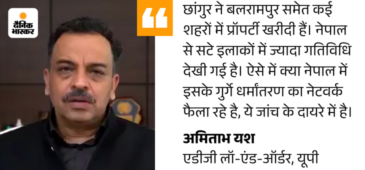 ADG लॉ-एंड-ऑर्डर बोले- नेपाल से सटे इलाके छांगुर के हॉटस्पॉट छांगुर गैंग पर एक्शन के बारे में UP के ADG लॉ-एंड-ऑर्डर अमिताभ यश कहते हैं, ‘ये एक बड़ा धर्मांतरण रैकेट है, जिसकी जांच ATS कर रही है। इसमें छांगुर पीर बाबा और उसकी मुख्य सहयोगी नीतू उर्फ नसरीन को 7 दिन की रिमांड पर लिया गया है। इन दोनों से पूछताछ में गिरोह के नेटवर्क, विदेशी फंडिंग और अवैध रूप से हासिल की गई संपत्तियों की जानकारी जुटाई जा रही हैं।’