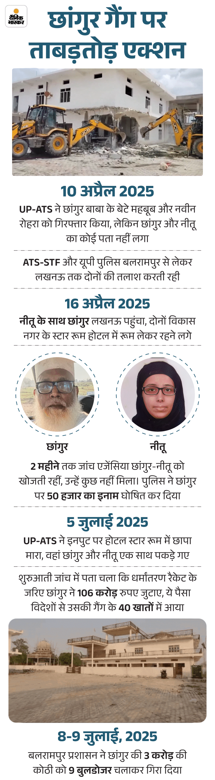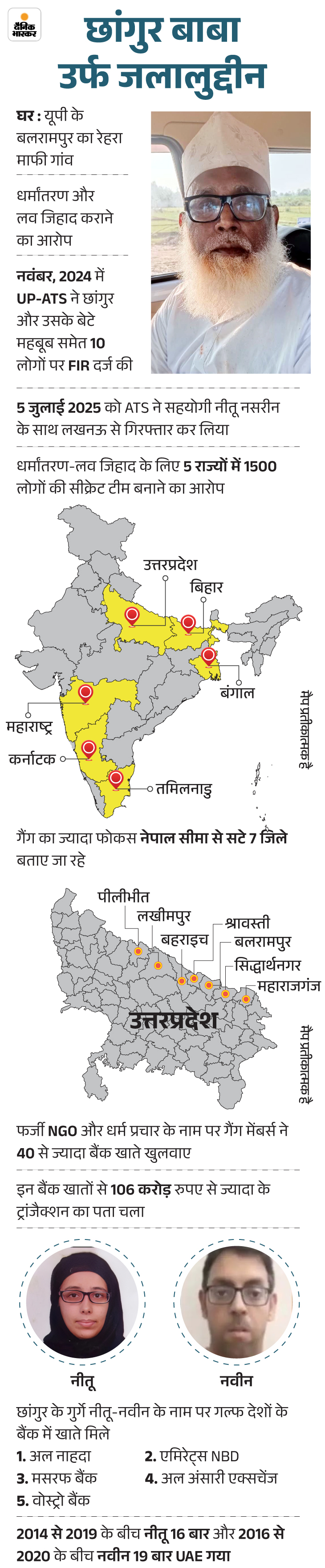 5 जुलाई को छांगुर बाबा को नीतू उर्फ नसरीन के साथ लखनऊ से गिरफ्तार कर लिया गया। बताया जा रहा है कि छांगुर गैंग ने UP-महाराष्ट्र सहित 5 राज्यों में 1500 लोगों की सीक्रेट टीम बना रखी है। इनके टारगेट पर 30 से कम उम्र की महिलाएं रहीं। वो धर्म परिवर्तन के लिए कोडवर्ड का इस्तेमाल करता था। बाबा के खाते में हुए 106 करोड़ रुपए के ट्रांजैक्शन की भी जांच की जा रही है।