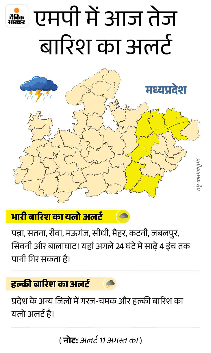 मौसम विभाग के अनुसार, अगले 24 घंटे के दौरान पन्ना, सतना, रीवा, मऊगंज, सीधी, मैहर, कटनी, जबलपुर, सिवनी और बालाघाट में तेज बारिश होगी। 12 अगस्त को भी पूर्वी हिस्से में तेज बारिश की चेतावनी दी गई है।