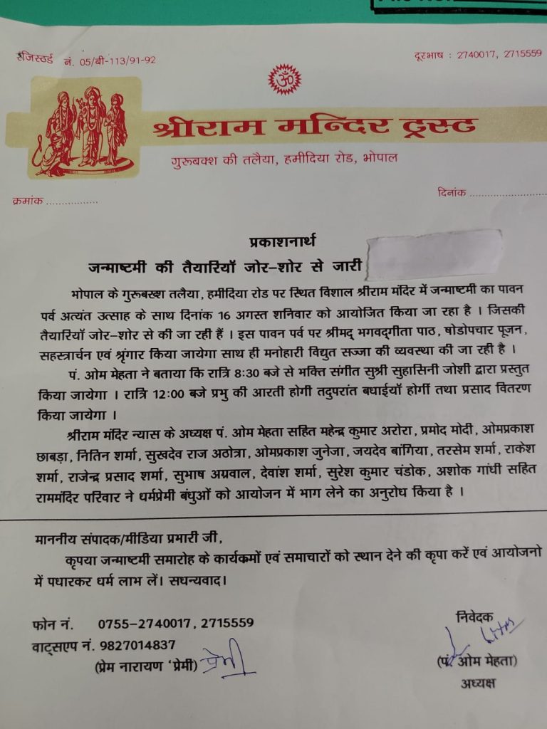 भोपाल। गुरु बख्श की तलैया हमीदिया रोड स्थित विशाल श्री राम मंदिर में जन्माष्टमी का पावन पर्व अत्यंत उत्साह के साथ दिनांक १६ अगस्त शनिवार को आयोजित किया जा रहा है।जिसकी तैयारियां जोर-शोर से की जा रही हैं। इस पावन पर्व पर श्रीमद् भगवद्गगीता पाठ,षोडोपचार पूजन, सहस्त्रार्चन एवं श्रंगार किया जायेगा साथ ही मनोहारी विधुत सज्जा की व्यवस्था की जा रही है।